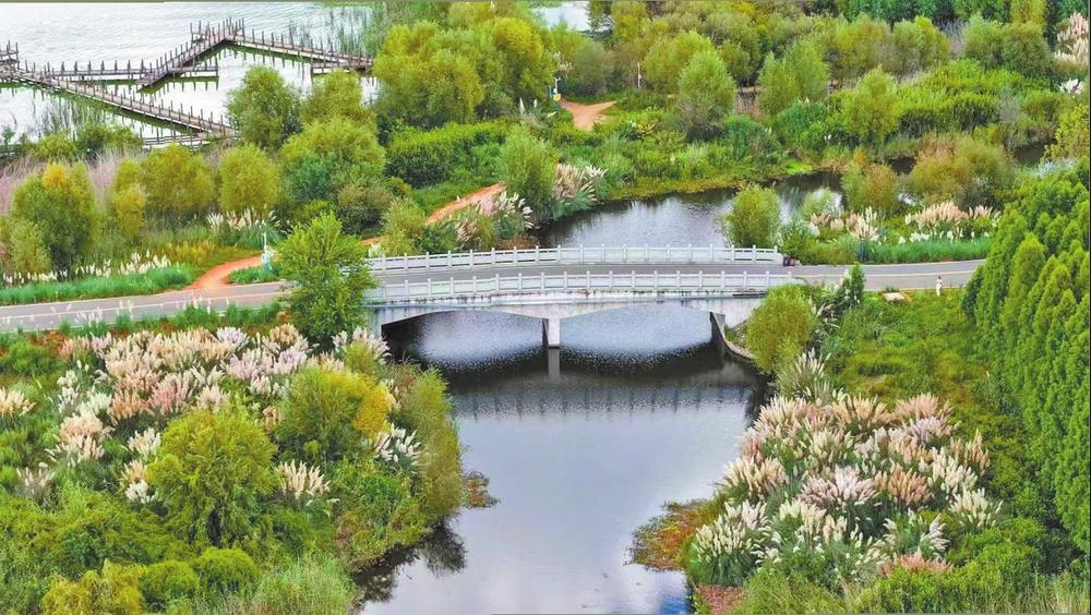 滇池绿道横跨水面,与林木、荻花相映成趣。