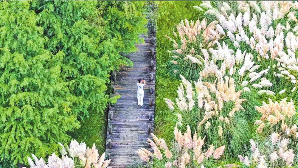 荻花与碧水、绿植构成秋日美景。